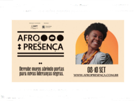 De hoje ao dia 10/09 acontece o evento digital e gratuito “Afro Presença 2021”, que discute a importância da inclusão de universitários negras e negros no mercado de trabalho. Informações e inscrições pelo site (www.afropresenca.com.br).
