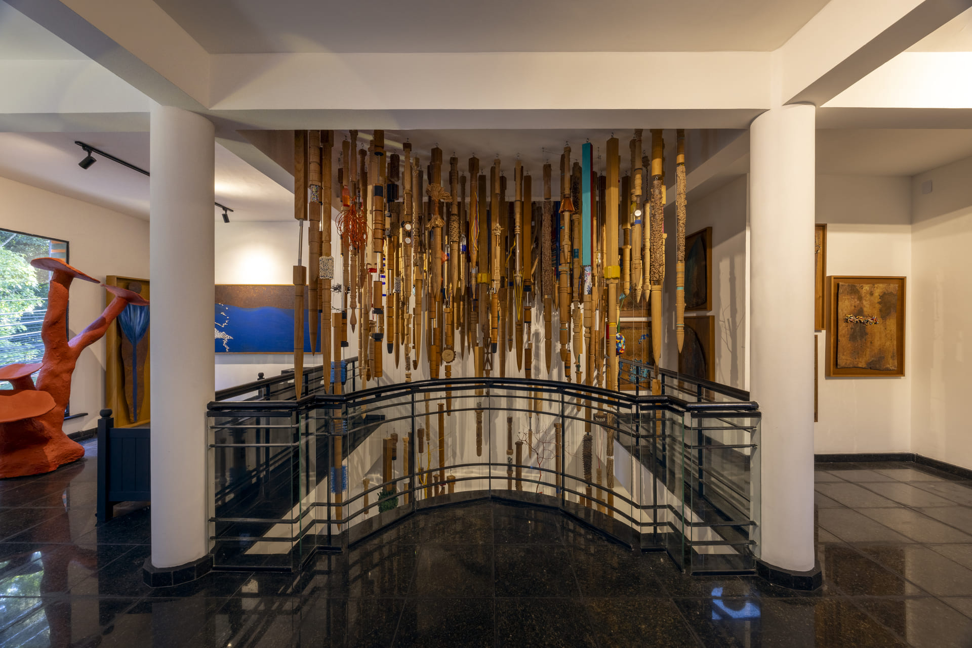 Não diria que foi uma intenção consciente. Esse contraste se revelou naturalmente quando visualizei a ocupação da casa. As linhas rígidas do Art Déco acabaram funcionando como contraponto, quase como uma moldura que acentua a fluidez da minha pesquisa. Foi mais um encontro do que um planejamento: a arquitetura trouxe essa tensão e minha obra respondeu a ela.