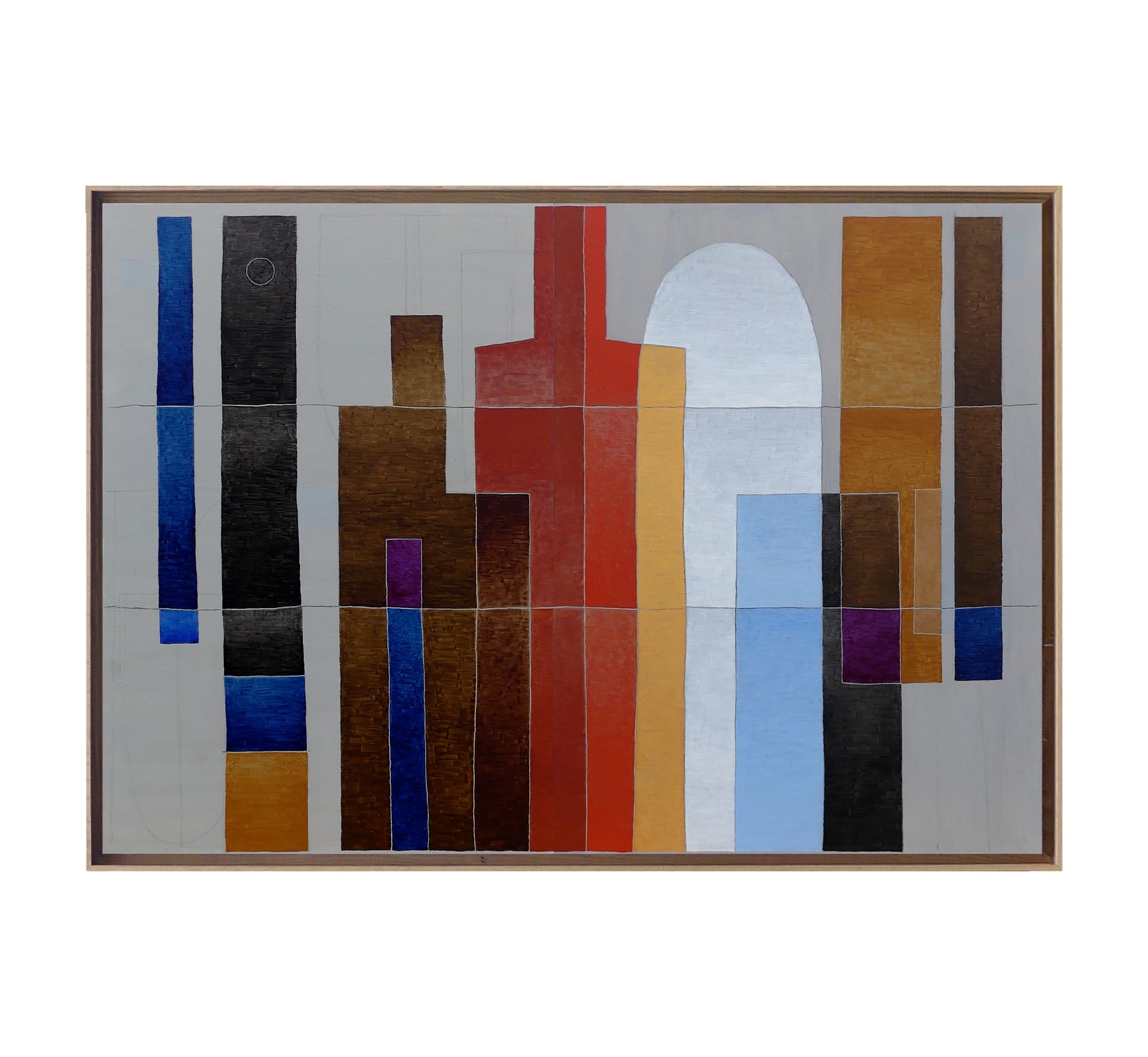 Já nas pinturas de Villani, a investigação recai sobre a memória cultural e a história da arte. Em suas telas, imagens e arquiteturas emergem de forma velada, organizadas em camadas que sugerem a convivência de diferentes tempos. O artista define suas construções como “arquiteturas colapsáveis”: linhas frágeis e campos de cor insinuam estruturas provisórias, marcadas pela instabilidade.