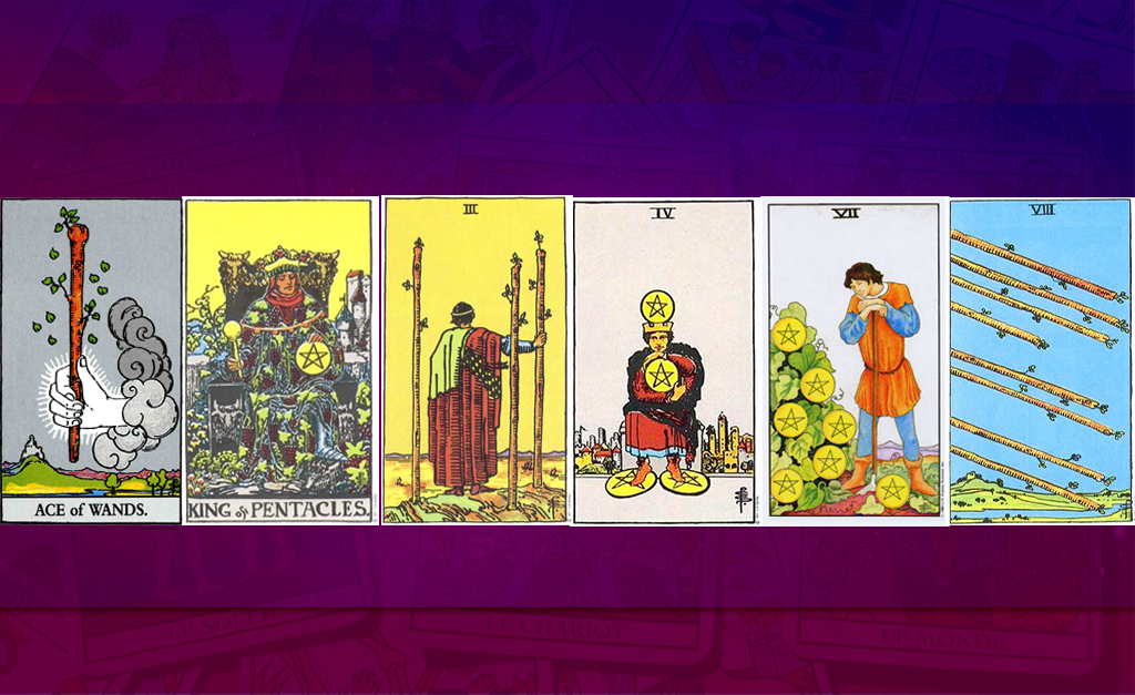 Cartas: Às de Copas, Seis de Copas, Rainha de Paus, Pajem de Paus, Dez de Ouros, Às de Espadas, O Mundo