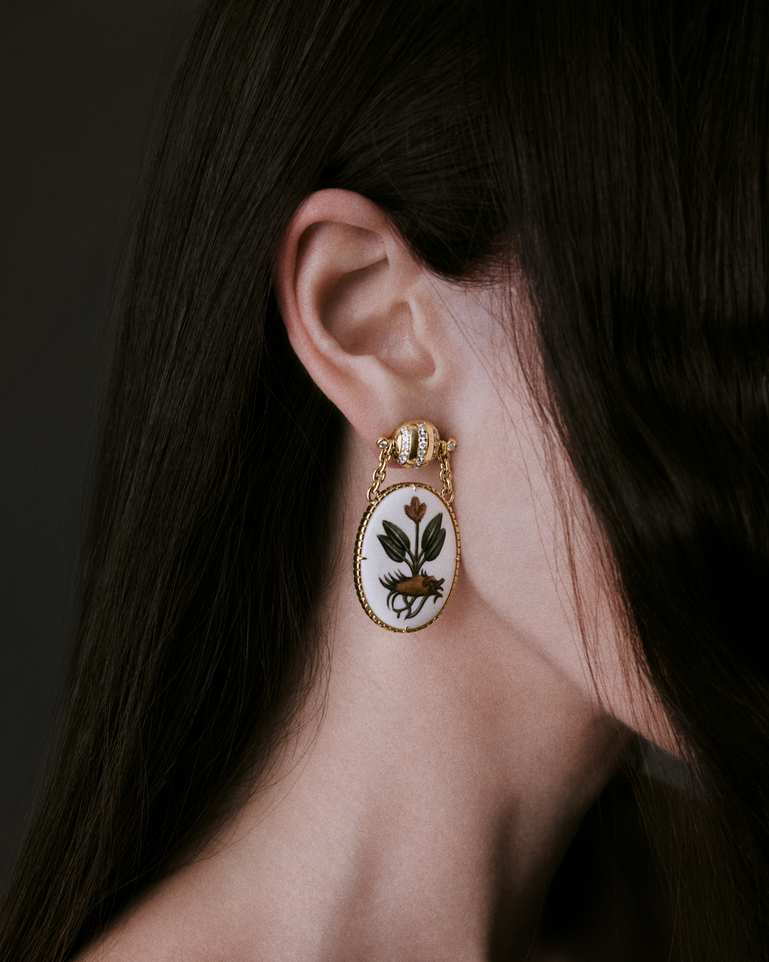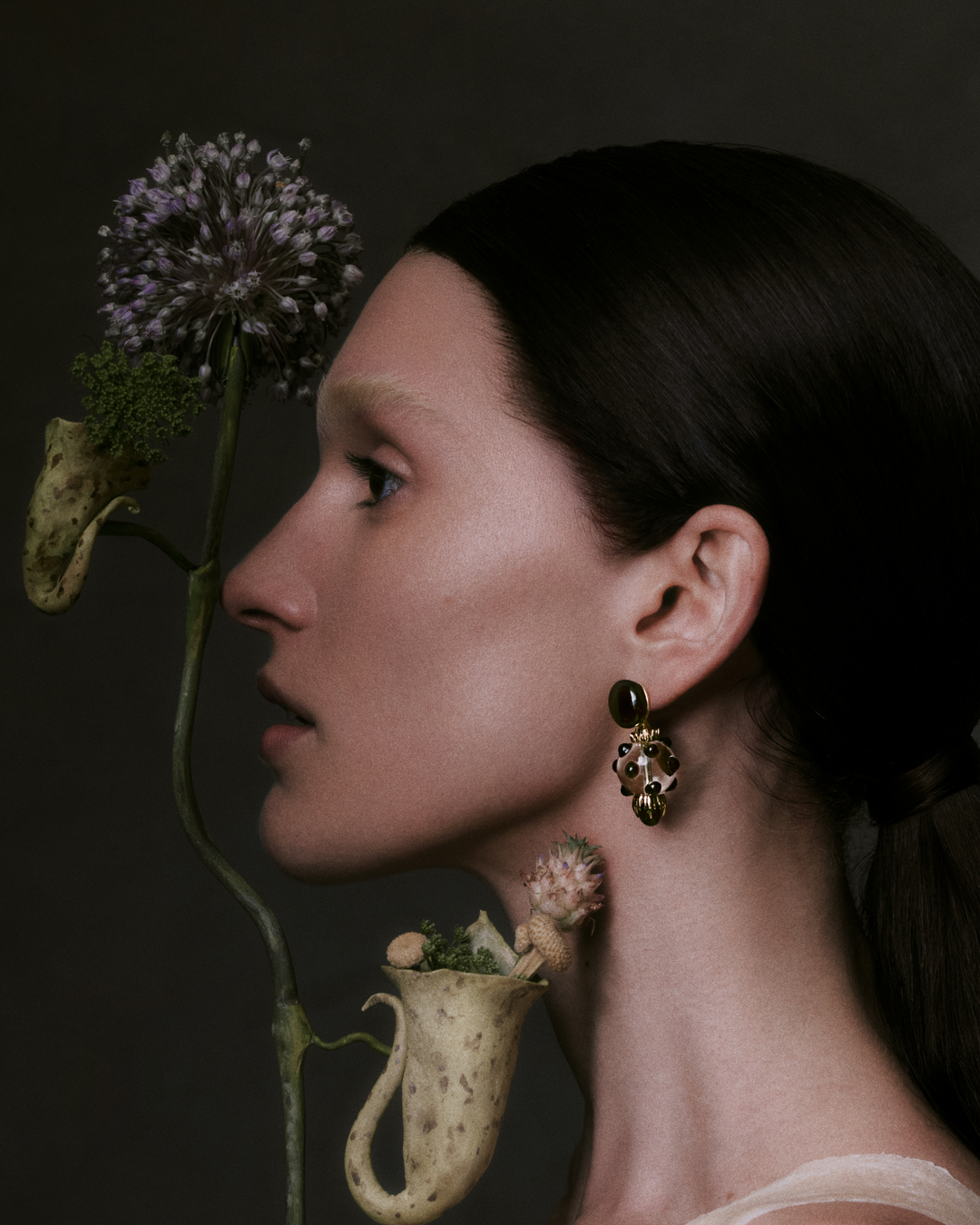 Pela primeira vez, a marca incorpora porcelana pintada à mão em suas criações, ampliando seu repertório técnico. O conjunto é finalizado com gemas preciosas, como esmeraldas, rubis, safiras e diamantes, reforçando a ideia de uma flora rara e imaginada.