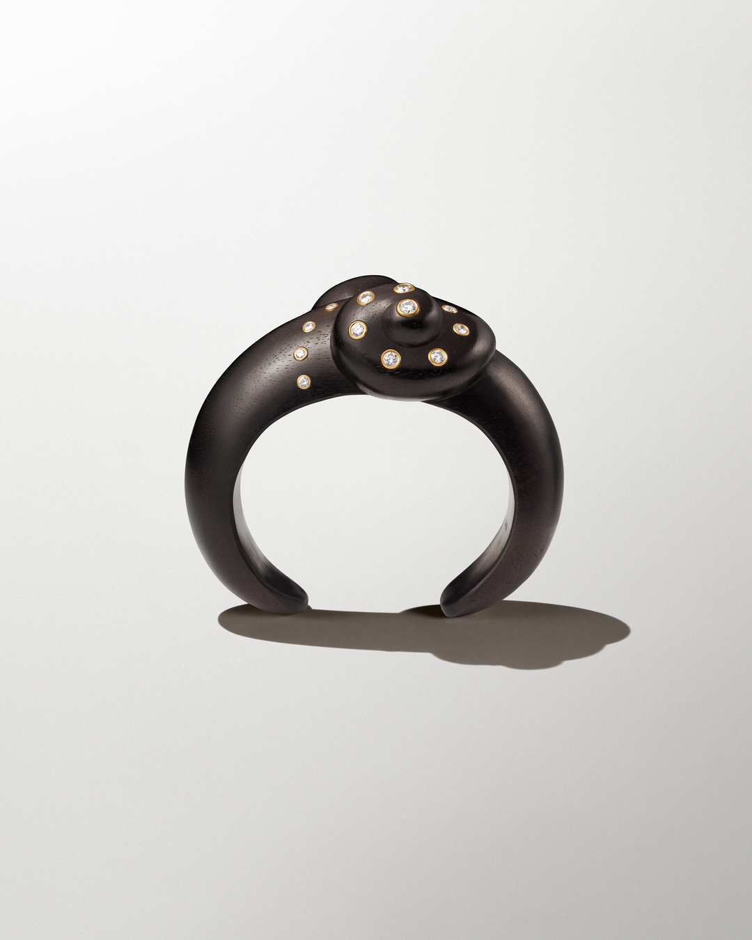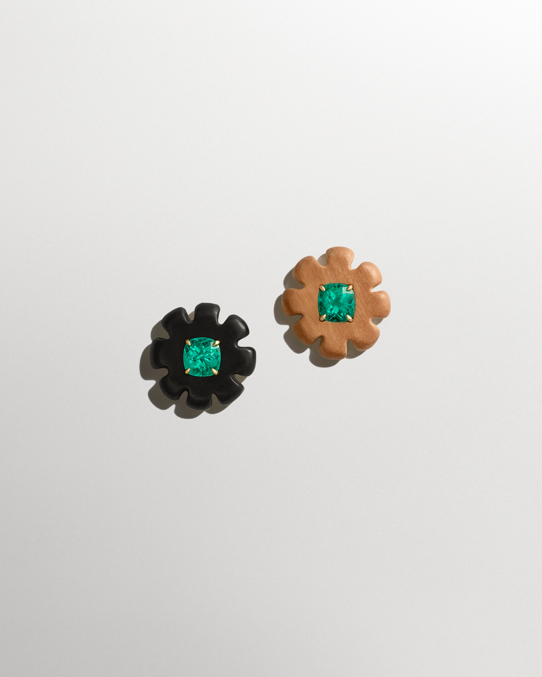 No campo material, a coleção revela novas experimentações. Águas-marinhas esculpidas evocam transparência e leveza, enquanto vidros de Murano acrescentam luminosidade às composições. Ao mesmo tempo, madeiras entalhadas introduzem textura e densidade orgânica às peças.