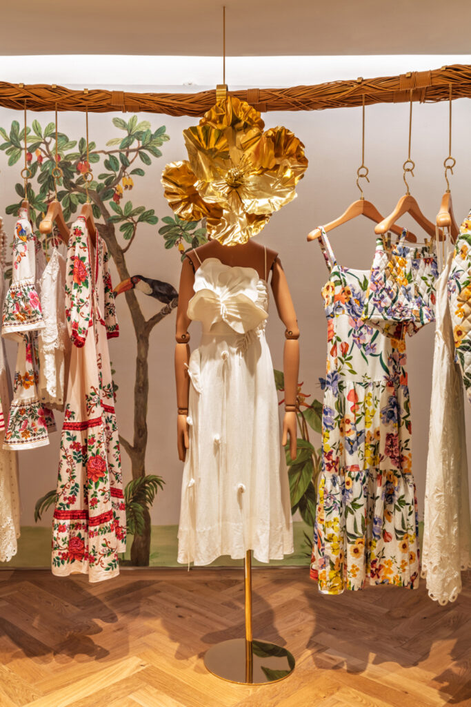 Assinada pela arquiteta Renata Gaia, a nova loja mantém o conceito de espaço sensorial, onde moda, arte e brasilidade se entrelaçam. A decoração celebra a natureza e a cultura brasileiras: o papel de parede com flora e fauna tropicais é criação da artista francesa Dominique Jardy, enquanto detalhes em marchetaria são do artista amazônico Maqueson Pereira da Silva. Escadas com textura de musgo e espelhos em palha sustentável produzidos pelo estúdio Rosalila completam o ambiente imersivo. Para o verão europeu, a fachada ganhará elementos florais desenvolvidos pelo time criativo da FARM Rio, prometendo impactar visualmente quem passa pela rua.