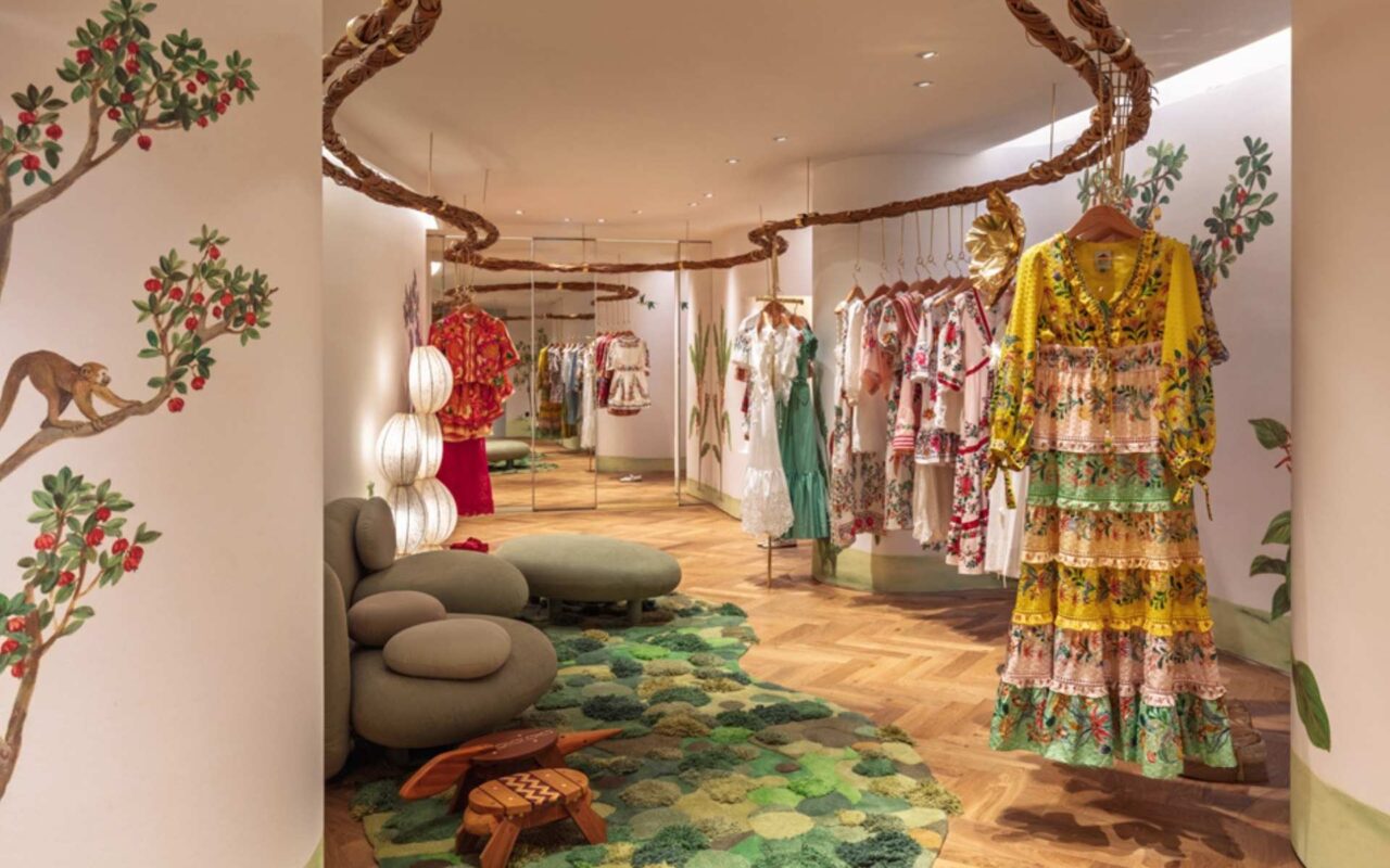 Assinada pela arquiteta Renata Gaia, a nova loja mantém o conceito de espaço sensorial, onde moda, arte e brasilidade se entrelaçam. A decoração celebra a natureza e a cultura brasileiras: o papel de parede com flora e fauna tropicais é criação da artista francesa Dominique Jardy, enquanto detalhes em marchetaria são do artista amazônico Maqueson Pereira da Silva. Escadas com textura de musgo e espelhos em palha sustentável produzidos pelo estúdio Rosalila completam o ambiente imersivo. Para o verão europeu, a fachada ganhará elementos florais desenvolvidos pelo time criativo da FARM Rio, prometendo impactar visualmente quem passa pela rua.