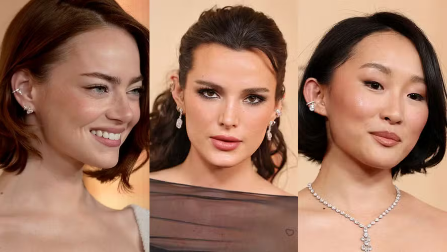 A tendência também marcou presença nos looks de Emma Stone, Bella Thorne e Ji-young Yoo. Argolinhas, ear cuffs e piercings minimalistas surgiram em camadas, transformando a orelha em ponto focal da produção.
