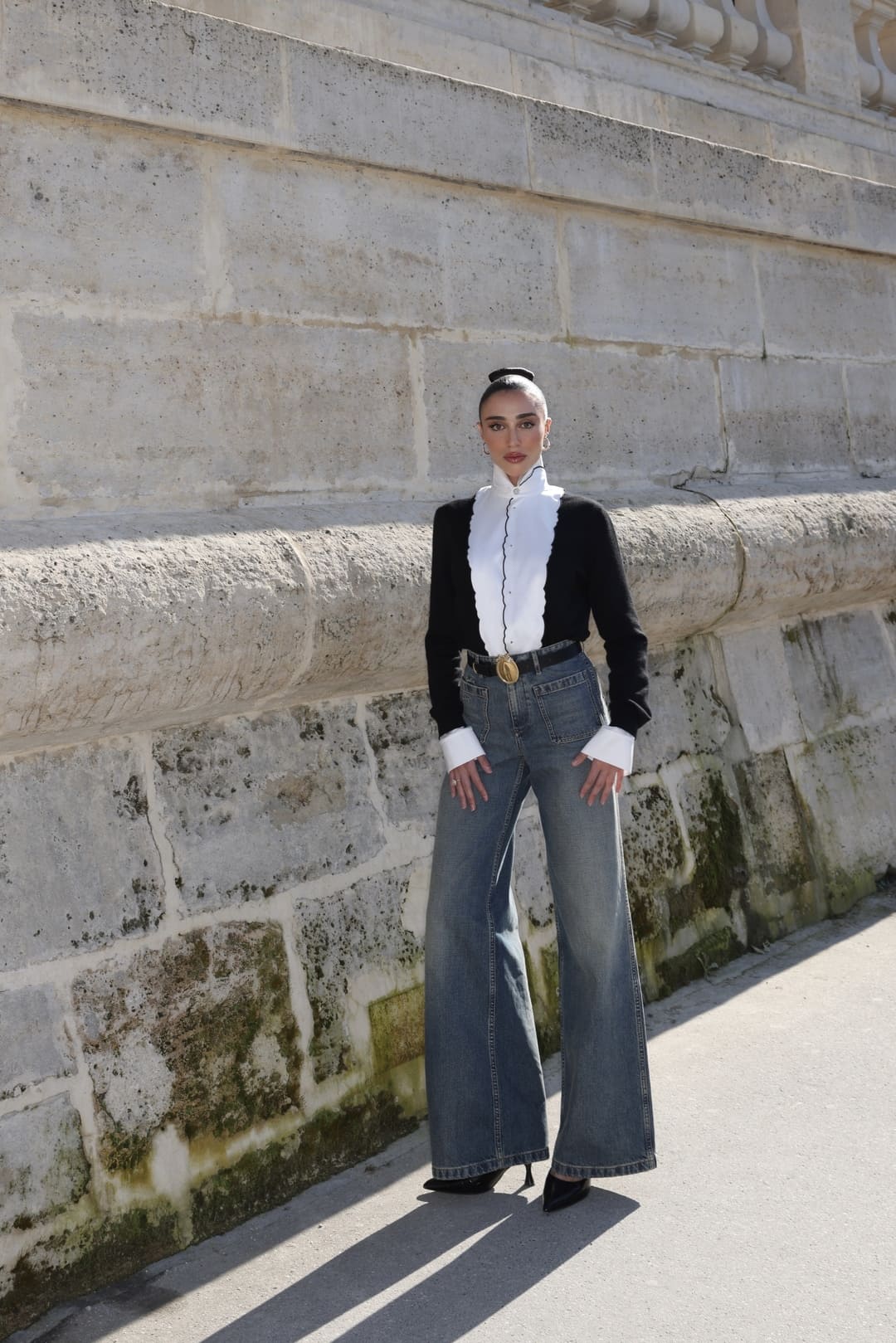 O jeans de cintura alta e modelagem ampla trouxe atualidade ao look, enquanto o cinto de fivela expressiva e os sapatos de bico fino definiram a silhueta com precisão. O resultado foi uma imagem elegante, porém descomplicada — alinhada à sofisticação discreta que atravessa a nova fase da maison.