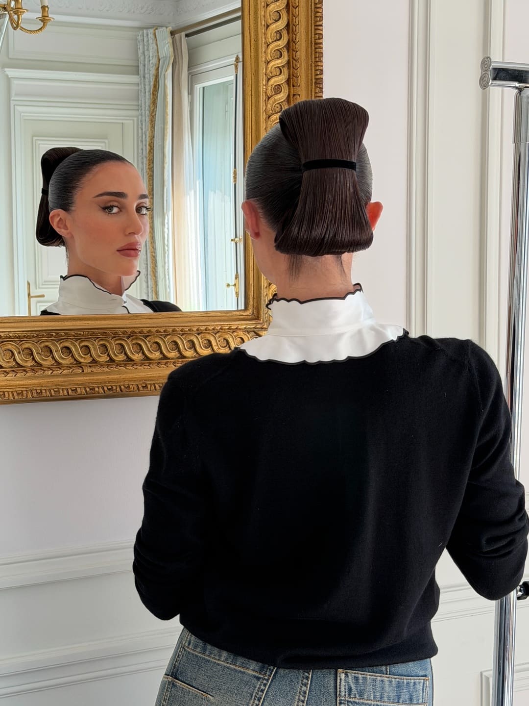 Para assistir ao desfile, a comunicadora optou por uma composição que dialoga com o equilíbrio entre rigor e leveza. A camisa branca de gola alta com babados frontais surgiu sob tricô preto ajustado, criando contraste entre textura e estrutura.