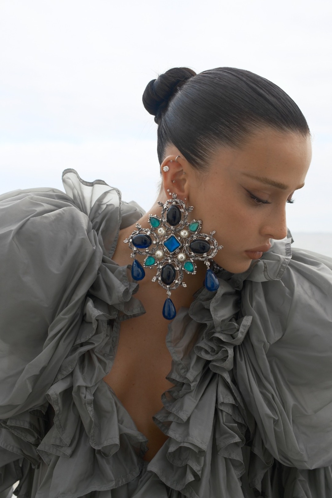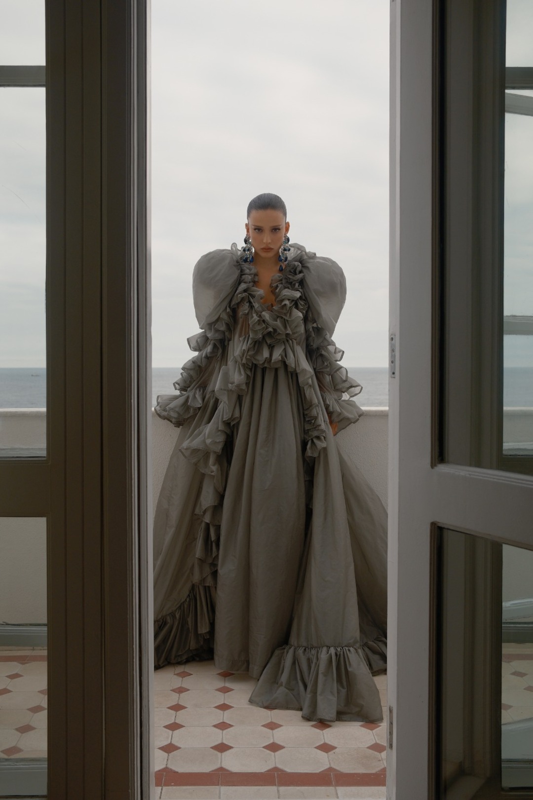 A peça se destacou pelas mangas gigot exageradas, pelo corpete estruturado com babados e pelo acabamento franzido, criando movimento e presença. O design inclui ainda arnês interno com fecho Cassandre, decote redondo, mangas estilo poeta com estrutura em crinolina e bolsos laterais discretos.