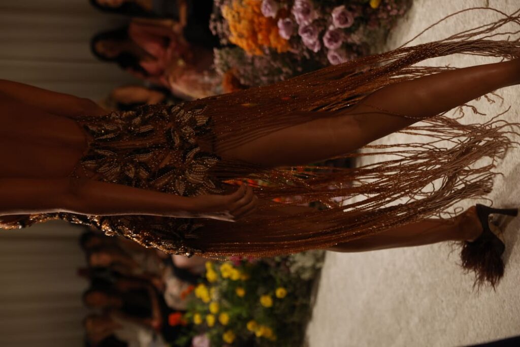 Na passarela, a inspiração se materializou em bordados minuciosos, franjas em movimento, estampas vibrantes e modelagens inspiradas nos anos 1980. O maximalismo ganhou suavidade em volumes orgânicos, contrapondo-se às formas retas e rígidas que dominam a moda contemporânea.