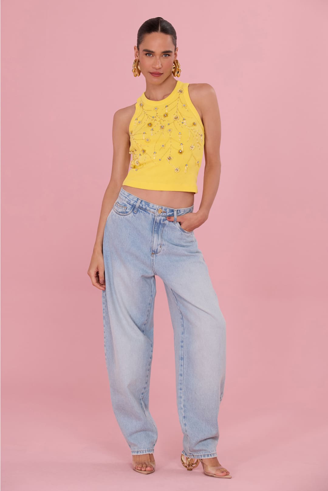 Entre os destaques da coleção estão calças e regatas que combinam materiais como denim, malharias e poliamida com elastano. Esses tecidos, frequentemente ligados ao beachwear, ganham nova leitura por meio do trabalho manual e das técnicas de bordado, criando peças que equilibram conforto, presença e versatilidade.