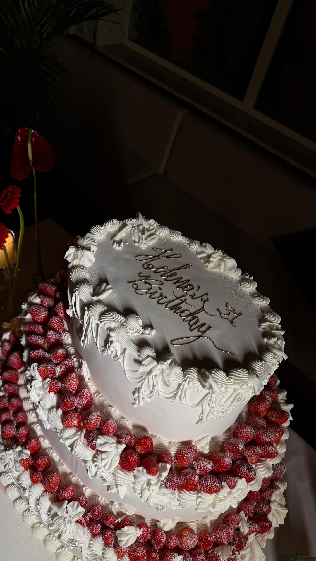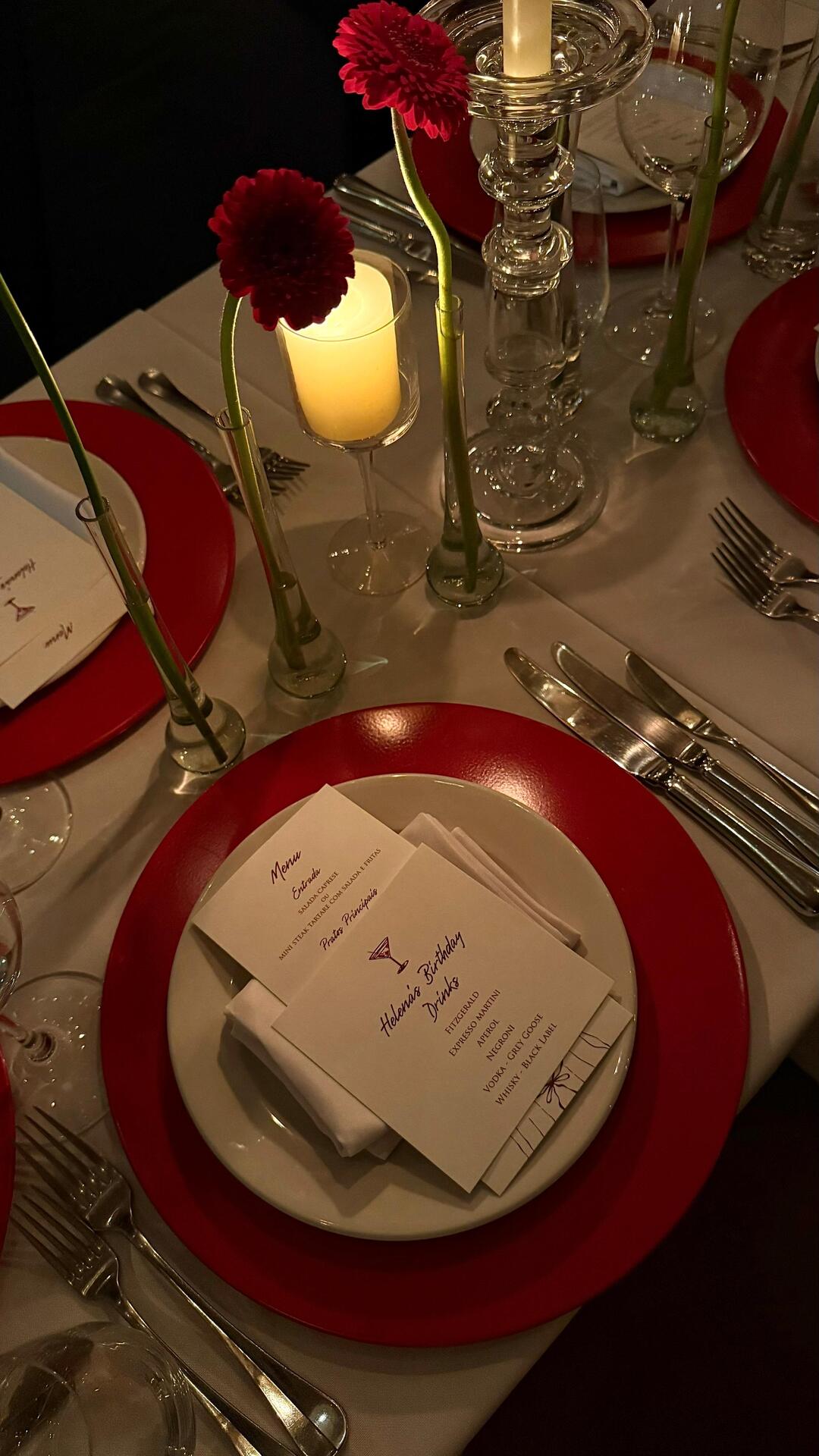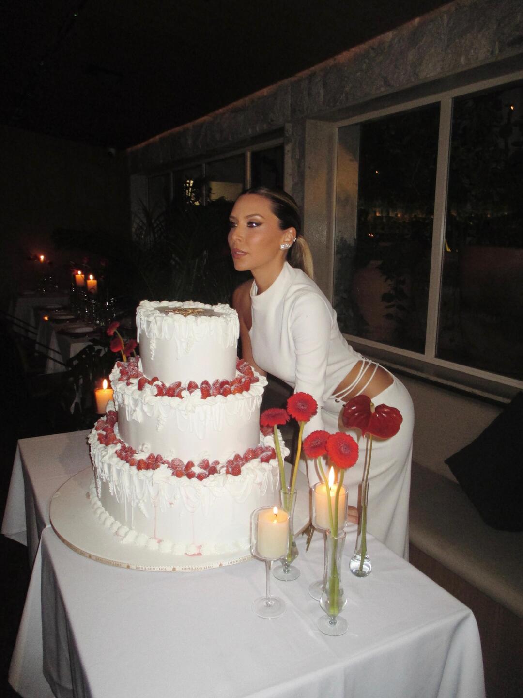 O décor, assinado por Bel Francez, apostou em uma estética vintage chic que trouxe sofisticação ao ambiente. Tons de vermelho e branco dominaram a composição, com velas em diferentes tamanhos e formatos, castiçais e arranjos florais criados por Tetê Castanha, que combinou rosas, gérberas e antúrios. Entre os detalhes que chamaram atenção ao longo da noite, o bolo de três andares desenvolvido por Denilson Lima Atelier reforçou o conceito da festa e se tornou um dos pontos altos da celebração.