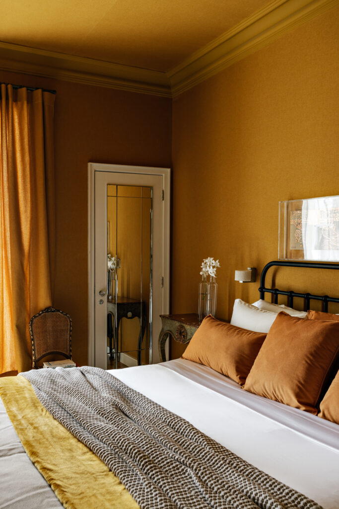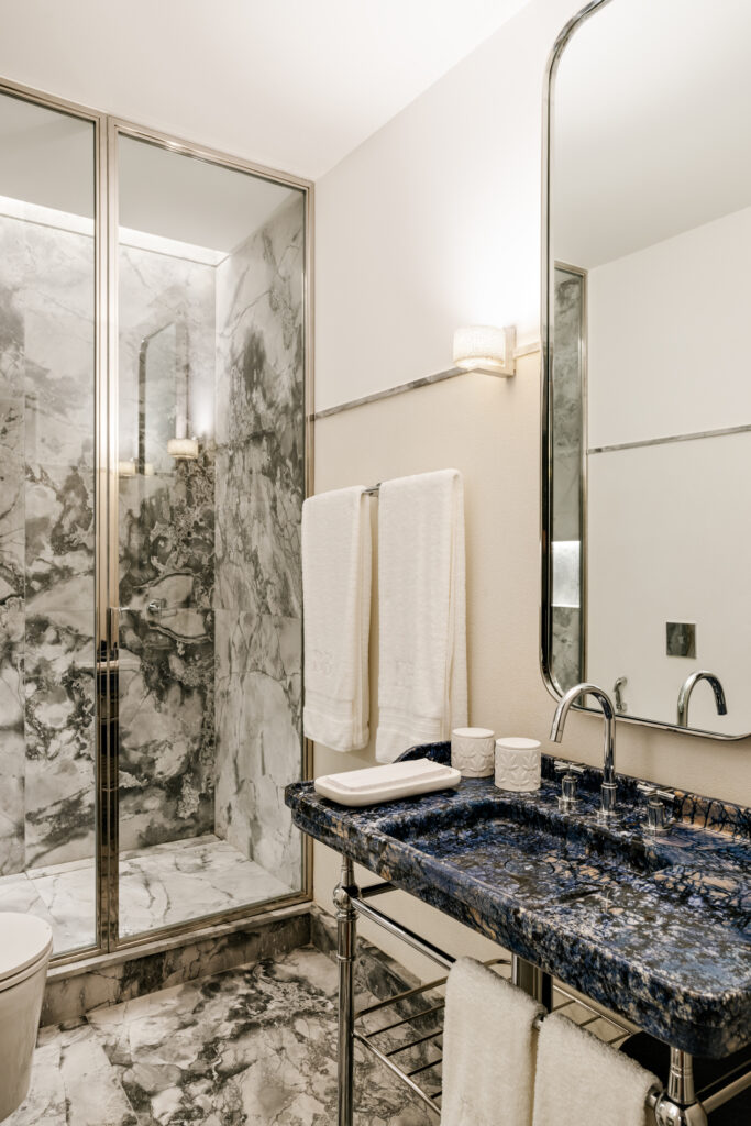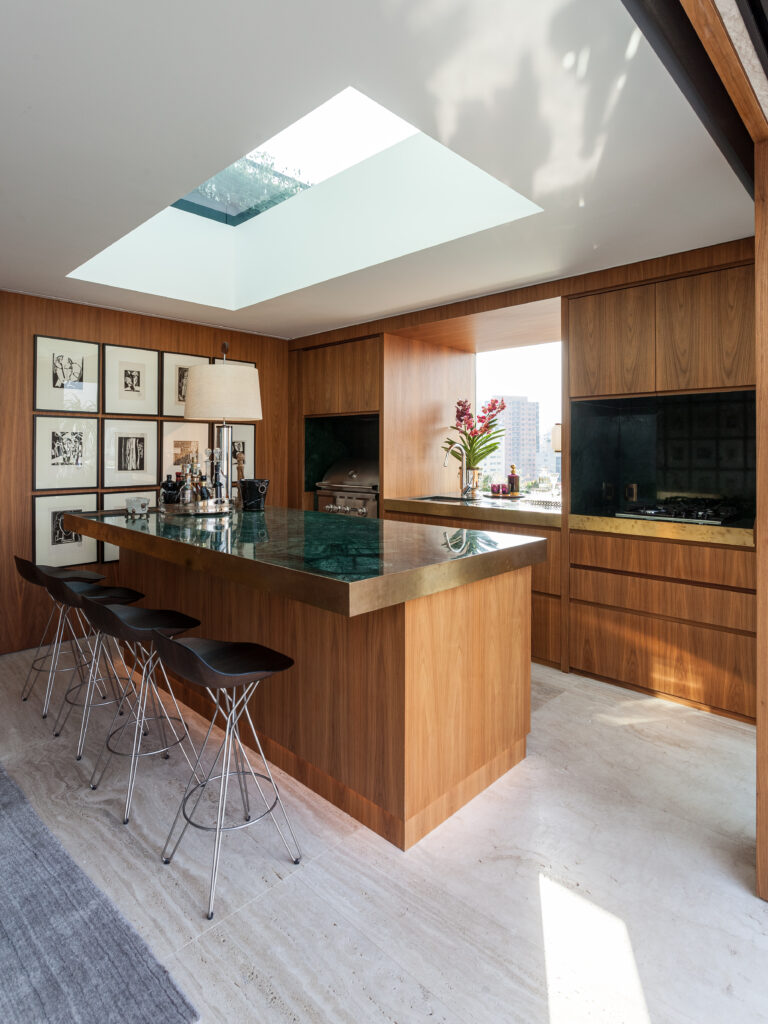 “Busquei manter as características da arquitetura da época em que o prédio foi construído, em 1945. Restaurei e preservei os pisos originais e as janelas externas, além de revestir os pórticos com mármore, mantendo a essência da época. Realizei intervenções significativas nas áreas da cozinha e serviço, resultando em uma estética art déco com elementos contemporâneos que harmonizam perfeitamente”. Olha só como ficou: