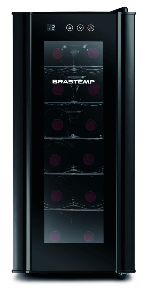 Adega Brastemp 12 garrafas com painel touch (110V) – moderna, compacta e ideal para servir vinhos na temperatura perfeita. Com porta de vidro, LED interno e controle digital, é um presente funcional e elegante.