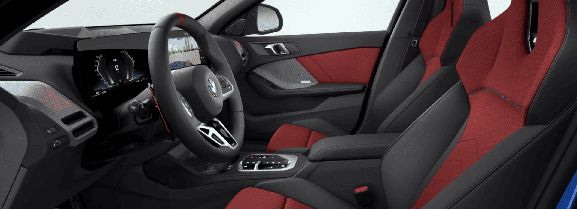 Por dentro, o M135 xDrive combina esportividade e sofisticação. Os bancos M Sport, o volante em couro com marcação vermelha e as costuras nas cores da divisão M reforçam a identidade do modelo.