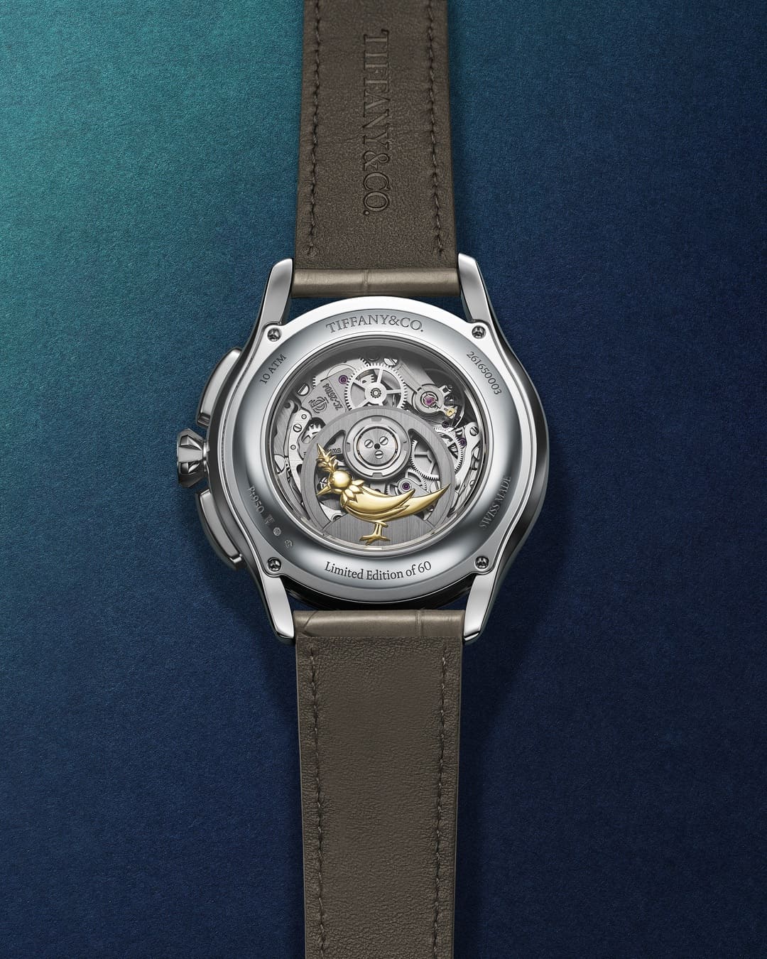 O fundo da caixa em cristal de safira revela um detalhe que sintetiza o espírito lúdico da marca: uma recriação do Bird on a Rock, ícone criado por Jean Schlumberger. O pequeno pássaro, com apenas 1,4 cm de largura, é esculpido à mão em ouro amarelo 18k e aplicado sobre o rotor vazado. Para acomodar o símbolo, a massa oscilante precisou ser cuidadosamente recalibrada. O fundo traz ainda a gravação “Limited Edition of 60”.