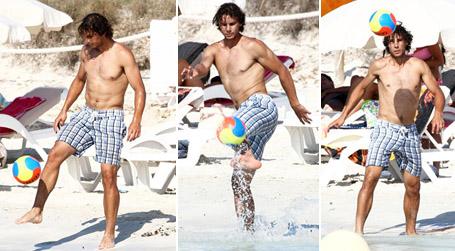 * De bermuda, na praia, ele resolveu bater uma bolinha e mostrou que leva jeito para a famosa "embaixadinha". Nem precisa dizer que uma turma de lulus parou só para ver o bonitão jogar…